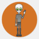 Legal alienígena acenando amigavelmente em fundo laranja.