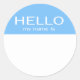 Um adesivo circular redondo com o tradicional texto "Olá, meu nome é" sobre cor azul de fundo do bebê, excelente de revelação de gênero ou eventos de chá de fraldas. Encontre uma variedade de saudações únicas que meu nome é adesivos nesta loja. Variações personalizadas disponíveis, basta clicar no botão de armazenamento de contatos.
