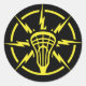 Perigo! Leitor de lacrosse de alta tensão. Legal emblema do estilo super-herói da cabeça do bastão de lacrosse com raio disparando de todos os lados.