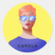 Um adesivo clássico amarelo-chic redondo com uma mulher clássica, cabelo e óculos vermelhos, e nome personalizável. Para cartas de música, presentes, para escola e escritório.