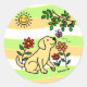Labrador Amarelo e Pau Clássico Verde para Ventiladores Labrador! Design de desenho do Labrador Retriever, colorido e bonito, amarelo, com flores. Adorável filhote de Labrador Amarelo sentado no jardim com flores e plantas verdes. Cartoon Labrador Retriever Dog Whimsy e engraçado criado por Naomi Ochiai do Japão.