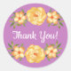 Folhas amarelas florais e verdes no adesivo "Obrigado" roxo