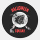 american cougar howling on full moon halloween night in graveyard surrounded by haunted witch, ghost saying boo and crows