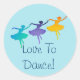 Este adesivo apresenta um fundo azul e um trio de silhuetas de bailarina, cada uma em diferentes tons de gradiente, e diz, "Amor à dança!"
