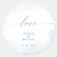 Adicione este belo adesivo do casamento de cor d'água ao seu dia especial. Este design apresenta um roteiro de na moda "amor", coração bonito com um lindo fundo de cor azul-d-água. Você pode personalizar este adesivo para qualquer evento; casamento, festa de noivado, chá de casais, janto de ensaio, etc.