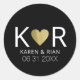 Coração de amor de ouro falsa com iniciais e nomes de casal no adesivo preto