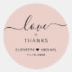 O adesivo rosa pincelado chique por seus cartões de agradecimento e favores de casamento com "obrigados + amor" em letras simples e um roteiro elegante com pincéis, seus nomes se juntaram por um coração e sua data de casamento.