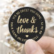 Adicione um toque personalizado aos favoritos para festas e agradeça suas notas com adesivos circulares personalizados "amor e obrigados" / selos de envelopes. Toda a redação nesta modelo é simples de personalizar para qualquer ocasião, como casamento, chá de panela, graduação, festa de aniversário, aniversário ou aposentadoria. O design preto e dourado apresenta a caligrafia moderna da escrita no nome e data do evento de tipografia central e na moda em círculo. Observe que o ouro é impresso a cor, não a folha metálica. Como opção, altere o texto curvo para um nome e endereço para fazer etiquetas de endereço de retorno redondo. Essas etiquetas elegantes adicionam um toque exclusivo e personalizado a uma celebração de dia especial.