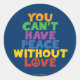 AMOR E PAZ. Este design muito simples, original e colorido diz: NÃO SE PODE TER PAZ SEM AMOR. Um sinal de paz senta-se dentro do "O" da palavra Amor. Defender a paz mundial, a paz na terra, a paz com os nossos inimigos, a paz nos nossos corações. Excelente para celebrar o Dia Internacional da Paz, estabelecido por uma resolução das Nações Unidas em 1981 e por vezes chamado Dia Mundial da Paz. Este artigo faz um presente único para mulheres e homens, para crianças, crianças e bebês, para rapazes e raparigas. Compre por outros itens no Compro Verde onde você pode comprar online - de adesivos, botões, ímãs, canecas, chapéus, posters, ornamentos e capas de telefone celulares a t-shirts, camisas, capuzes, outros roupas e muito mais!