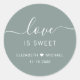 O adesivo verde-sábio para os favores do seu casamento, com "o amor é doce" em letras brancas limpas e uma elegante escrita branca com baloiços, seus primeiros nomes se juntaram por um coração e sua data de casamento.