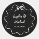 Este adesivo chic e elegante de favorito de casamento apresenta um quadro desenhado à mão, ondulado e ilustrado com um arco e um roteiro manuscrito de na moda para um convite de casamento ao estilo parisiense ou francês. Esta opção de cor clássica é preto escuro e marfim.