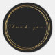 Um adesivo redondo moderno apresenta um fundo preto profundo rodeado por um duplo anel dourado e a elegante escrita "Obrigado", criando um selo luxuoso e minimalista para envelopes, embalagens de pequenos negócios e lembranças de casamento. A aparência dourada refinada é um efeito impresso. Ideal para demonstração de apreço aos clientes e embalagens de presentes.
