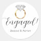 Essas adesivos personalizados dizem Engajado! junto com um anel de noivado de diamante branco com faixa dourada e os nomes da noiva e do noivo na parte inferior. Perfeito para uma festa de noivado!