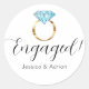 Essas adesivos personalizados dizem Engajado! junto com um anel de noivado de diamante azul com faixa de ouro e os nomes da noiva e do noivo na parte inferior. Perfeito para uma festa de noivado ou anúncio de save the date!