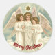 Uma imagem bonito e antiga de três anjos cantando de um livro de música é apresentada neste adesivo redondo para o Natal. Com a mensagem "Feliz Natal", pode ser usada para essas mensagens especiais, decoração e reserva de sucata e muito mais para o Natal!