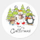 Um adesivo de design de Natal bonito e colorido com um urso polar, pinguim e rato todos com lenços e skates de gelo com árvores cobertas de neve e texto que diz É Natal!