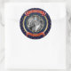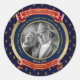 Celebre seu aniversário de aniversário com este elegante prato de retrato comemorativo. Faixas douradas simples e faixas vermelhas com acabamento dourado sobre um fundo azul-marinho com padrão de flor-de-lis criam a moldura perfeita para sua fotografia favorita. Substitua a foto e o texto de amostra pelos seus para um presente único.
