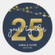 Este elegante adesivo redondo de 25 aniversário apresenta cordas de luzes e "25" em ouro falso com "anos juntos" em branco contra um fundo azul escuro. Veja o convite correspondente e itens como adesivos e carimbos aqui https://www.zazzle.com/collections/strings_of_lights_faux_gold_celebration_collection-119311942951401241?rf=238364477188679314 Personalize-o com seus detalhes substituindo o texto do marcador de posição. Para obter mais opções, clique no botão "Personalizar". *Observe que a Marca d'água do Zazzle que aparece na visualização de zoom NÃO aparecerá no produto impresso final. © Rosewood e Citrus