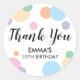 Este adesivo de festa de aniversário divertida apresenta um padrão de pontos de configuração do arco-íris desenhado à mão juntamente com a tipografia e o texto personalizado "Obrigado!". Apenas personalize o texto e faça dele seu!