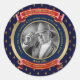 Celebre seu aniversário de aniversário com este elegante prato de porcelana comemorativo. Faixas douradas simples e faixas vermelhas com acabamento dourado sobre um fundo azul-marinho com padrão de flor-de-lis criam a moldura perfeita para sua fotografia favorita. Substitua a foto e o texto de amostra pelos seus para um presente único. Faz um lindo presente para aniversários de aniversário, eventos comemorativos, aniversários de casamento, formaturas, aposentadorias, promoções, conquistas acadêmicas/culturais e outras ocasiões especiais.