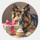 Bons adesivos de aniversário. Um German shepherd bonito com a cabeça descansando em um presente de aniversário.