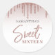 O adesivo clássico redondo 16 festa de aniversário moderno e elegante que você pode personalizar facilmente com os detalhes do seu partido. Apresentando gotejamento de brilho com fundo de gradiente ouro rosa e tipografia de script.