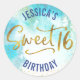 "Feliz Doce 16". Celebre o aniversário dela com este estonteante, simples, festivo, adesivo redondo personalizado. Folhas de ouro cintilante minúsculos pontos brilhantes de confete e script de tipografia, juntamente com o tipo moderno azul marinho, sobrepõem um fundo azul-turquesa de aquarela. Personalize o texto personalizado com o nome da sua filha. Excelente para a vanguarda que ama brilho e brilho modernos e que garante que adicione diversão na moda ao seu partido especial! Basta digitar o nome da aniversariante e você pode personalizar facilmente este convite de aniversário. Por favor, me mande mensagens com quaisquer perguntas ou solicitações.