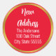 Um roteiro branco elegante está no topo. Você pode editar o script se desejar (mostrado: Novo Endereço). Três linhas de texto sem script estão sob o script. Você pode editá-los para mostrar seu nome e novo endereço. O adesivo é vermelho vivo. A borda do ouro não é bobagem.