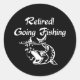 Aposentado! Indo Pescar. Texto branco sobre fundo preto com um peixe branco prestes a morder a isca num gancho.