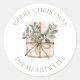 Estes adesivos de férias apresentam um presente embrulhado em água, amarrado com uma fita bege, e decorado com sulcos verdes de eucalipto. As palavras "Feliz Natal" aparecem na fonte bege serif, com o nome da sua família abaixo.