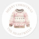 Estes vinhetas de férias bonitinhos apresentam um suéter moldado com flocos de neve em tons de rosa pastel e bege. As palavras "Feliz Natal" aparecem na fonte bege serif, com o nome da sua família abaixo.