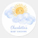 Este chá de fraldas bonito é decorado com uma aquarela amarela, sol, nuvens e tipografia azul na moda. Facilmente personalizável. Original Watercolor © Michele Davies.