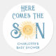 O adesivo de chá de fraldas deste menino bonitinho mostra o texto "Aqui Vem O Filho" em tipografia retrô azul com um sorridente sol amarelo-aquarela. Facilmente personalizável. Original Watercolor © Michele Davies.