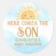 Este adesivo de chá de fraldas com o tema do sol mostra o texto "Aqui Vem O Filho" na tipografia de na moda com um lindo sol de aquarela amarela sobre um fundo azul-céu. Facilmente personalizável. Original Watercolor © Michele Davies.