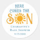 Este adesivo de chá de fraldas com o tema do sol bonito apresenta uma aquarela amarela e "Aqui vem o Filho" na tipografia azul-na moda. Perfeito para o chá de fraldas de um menino. Facilmente personalizável. Original Watercolor © Michele Davies.