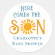 Este adesivo de chá de fraldas com o tema do sol bonito apresenta uma aquarela amarela e "Aqui vem o Filho" na tipografia azul-na moda. Perfeito para o chá de fraldas de um menino. Facilmente personalizável. Original Watercolor © Michele Davies.