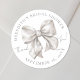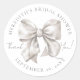 Um adesivo clássico e elegante de chuveiro de noiva com laço branco, apresentando um laço de aquarela branca macia superdimensionado. Na parte superior, tem o nome da noiva e “Chuveiro de Noiva”, e na parte inferior, a data. No centro, ao lado do laço branco, está “Muito Obrigado!” em escrita graciosa. Este design simples e atemporal de chuveiro de noiva usa texto cinza em uma mistura de tipografia serifada e cursiva, criando um visual refinado e encantador. Você pode personalizar as cores da fonte e o fundo para combinar com o seu estilo. Etiqueta Adesiva Personalizada de Laço Branco Aquarela Elegante para Tema de Chuveiro de Noiva.