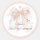 Bonito e feminino, este adesivo redondo personalizado foi projetado para celebrar a primeira comunhão de uma menina. O design apresenta um laço em aquarela rosa pastel com flores cor-de-rosa e uma borda rosa pastel suave. Uma linda cruz prateada está acima do laço como um símbolo do Cristianismo. Fácil de personalizar e preparar para essa ocasião memorável na vida de sua filha. Este design de adesivo está disponível em 2 tamanhos; mostrado aqui no tamanho menor de 1 1/2 polegadas de diâmetro, eles também estão disponíveis em um tamanho maior de 3 polegadas de diâmetro. Use em lembrancinhas de agradecimento, presentes ou como selos de envelope em seus convites.