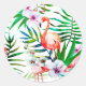 Trabalho de arte de tema tropical de um flamingo cor-de-rosa e plantas tropicais verdes com flores e palmas de hibisco contra fundo branco neutro. Uma peça de arte divertida e colorida.