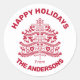 Árvore de Natal de estilo escandinavo, com cavalos de dala vermelha, flores e renas em forma de árvore de Natal. A frase Felizes Feriados de "seu nome de família" é apresentada em torno do design da Árvore de Natal, Excelente para selar os envelopes da Placa de Natal, usando como etiquetas de presentes, tantas opções. O texto é totalmente personalizável na página do produto, para alterar estilos de fonte ou cores, use a ferramenta design para um controle completo sobre o processo de personalização.