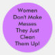 As Mulheres Não Fazem Messes é um produto de declaração humorístico. Isto põe em evidência o fato de que as mulheres não devem ter de limpar a bagunça dos outros. Infelizmente, muitas mulheres podem ainda estar relacionadas com o fato de muitas vezes serem deixadas a limpar-se depois de outras. Se você é uma daquelas mulheres que podem se relacionar com isso, então você pode apreciar o humor nesta declaração.