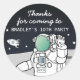 Obrigado de aniversário do espaço externo, você coloca adesivos apresentando um astronauta na lua, um foguete, estrelas e um modelo de texto moderno que é fácil de personalizar.
