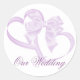 Um belo adesivo de envelope de casamento feito em lavanda e branco. Dois corações de lavanda pastel entrelaçados e amarrados com um arco correspondente, com texto mais escuro do roteiro de lavanda abaixo da leitura, Nosso Casamento. O texto é completamente personalizável para ler o que você quiser. É uma maneira elegante de terminar o seu convite de casamento.