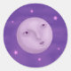 Uma lua lavanda rodeada por uma estrela cintilante sobre um fundo roxo sonhador.