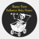 Etiquetas de chá de fraldas de Halloween personalizadas que oferecem um design redondo, fundo preto e uma inscrição dourada no topo dos autocolantes. Os adesivos de chá de fraldas mostram um esqueleto de bebê sentado em um carrinho e brincando alegremente com um chocalho em forma de osso. Toda a redação pode ser personalizada para o dia da festa de chá de fraldas do Dia das Bruxas.