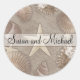 Belos vinhetas de casamento com o tema da praia, com uma estrela no centro. Uma linha branca guarda os nomes da noiva e do noivo. O fundo é uma cor natural de areia, com muitas conchas marinhas. Borda castanha de chocolate. Os adesivos tropicais divertidos podem ser personalizados instantaneamente.