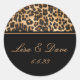 Vinheta redonda de casamento mostrada numa impressão de leopardo preta e safari. Personalize este adesivo com os seus nomes e data.