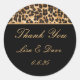 Esta obrigado redonda que você cola é mostrada em uma impressão de leopardo preta e safari. Personalize este adesivo com seus nomes e data com este modelo.