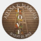Madeira de celeiro russa e escada de madeira vintage com folhas coloridas de queda e letras de "amor" design sobre madeira de celeiro escuro, adesivo de favor de casamento com noiva e nome de noivo e casamento.