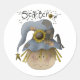 Autumn Primsies: uma cabeça espantageada, branca, com um chapéu azul e um pequeno corvo preto. Com "Espantalho", o verduto e as espirais de folhas. Criada usando trabalho de arte por Trina Clark.